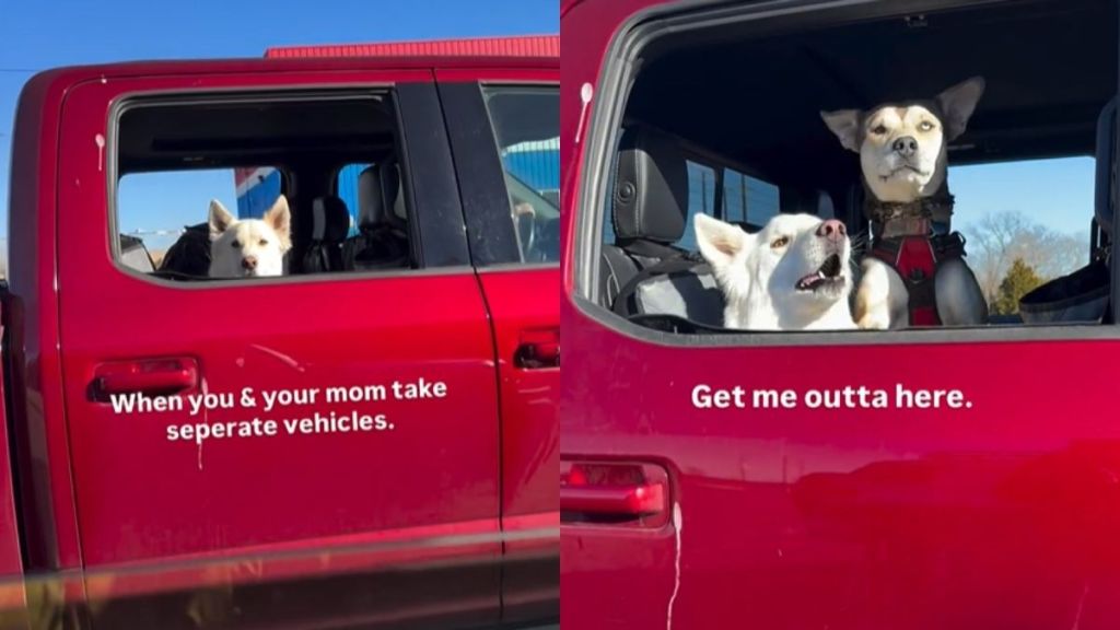 In a hilarious Instagram video from @aspenshores, two rescue dogs — Aspen and Willow — get visibly confused and increasingly impatient when they realize their mom pulled up in a different car. The onscreen caption tells the story, “When you & your mom take seperate vehicles.” It adds, “But realize you’re both going to the park,” speaking from the dogs’ point of view as they think, “Get me outta here.”
