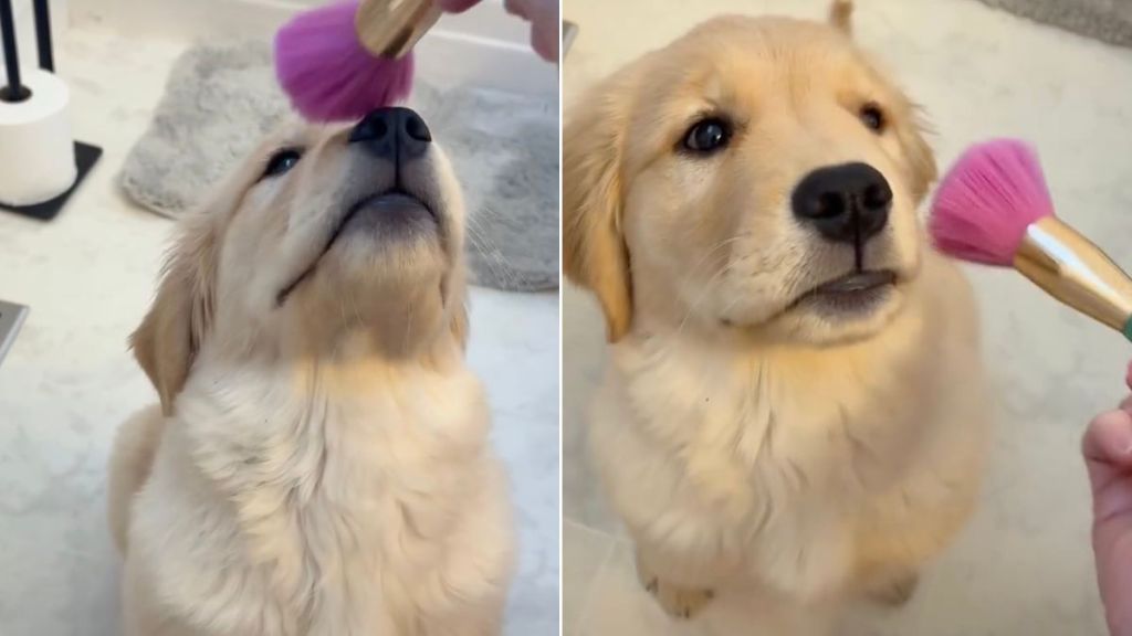 Golden Retriever reacts to being stroked with a blush brush in adorable video