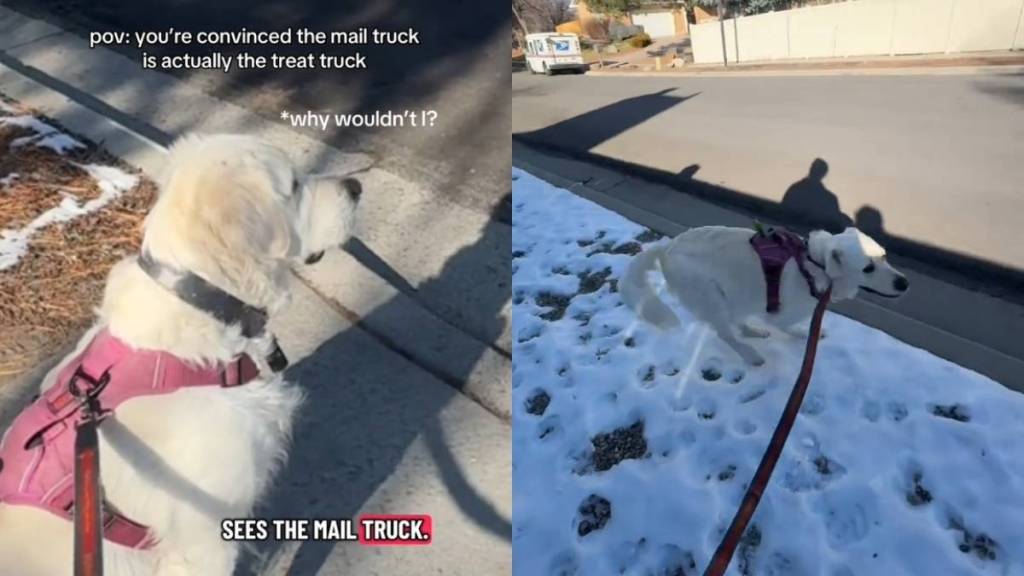 In the video, the dog walker captures the Golden Retriever locking in to look for a mail truck like it’s a snack stand. The onscreen text explains why: “Pov: you’re convinced the mail truck is actually the treat truck.”