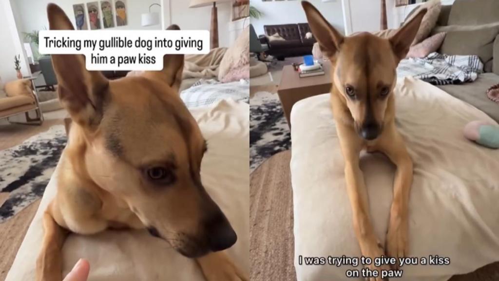 The onscreen caption reveals the owner’s plan: “Tricking my gullible dog into giving him a paw kiss.” And Cactus does not make it easy. Each time his owner reaches for his paw, Cactus pulls it back and “attacks” with fast, mouthy little dramatic snaps — like a puppy throwing a mini tantrum.