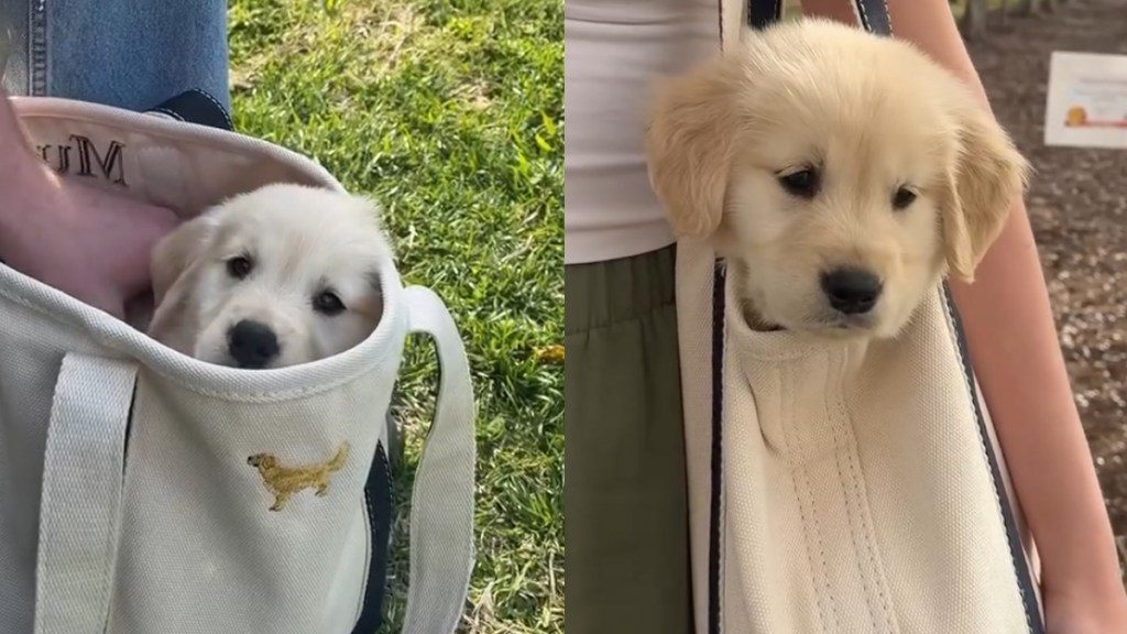 People who work at vet clinics love the video. They appreciate that she is keeping him safe while he is still young. “Nothing cuter,” another person added. He rests his face right on the handle of the bag. The tote is basically his own personal transport system.