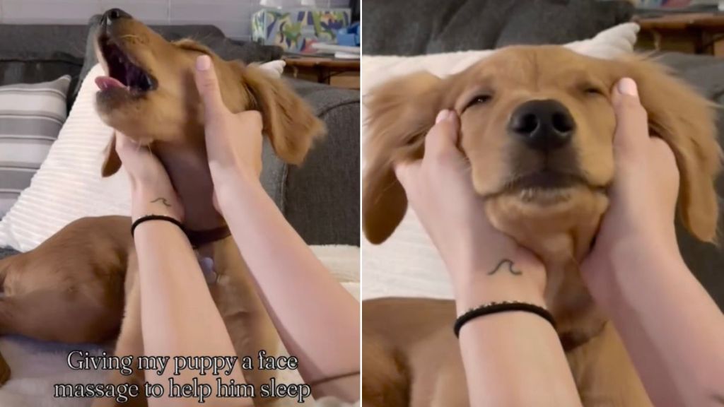 Some puppies fight sleep like it’s their job, but Charlie the Golden Retriever puppy relies on his mom’s face massage to handle it. And this adorable video from @thegoldenlifeofcharlie_ on Instagram is proof. In the video, Charlie sits on a couch as his owner gives him a slow face massage to help him wind down. The on-screen text explains, “Giving my puppy a face massage to help him sleep.”