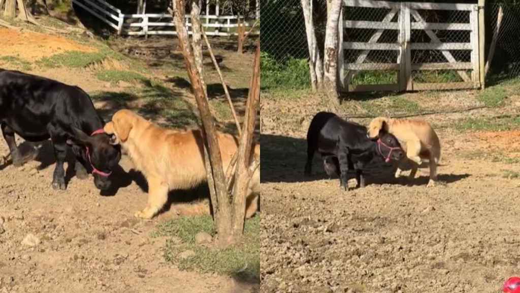 The video’s caption, written in Portuguese, jokes that they have basically switched roles. It translates to Oliver thinking “he’s an ox,” and Yuca “thinks he’s a dog.” The caption further adds that this is just farm life with a “country golden,” raised in the mud and in good company.