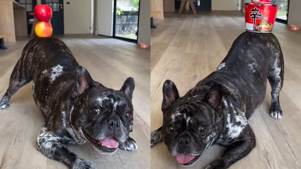 The video’s on-screen caption says, “Random things my frenchie can balance on his tushy,” and honestly, it is a flex. Cosmo does not even start small — one moment, the dog is holding steady with apples stacked on top of each other, and next, he is balancing a tall tumbler like it belongs there. The video keeps upping the stakes, and Cosmo keeps shining bright.