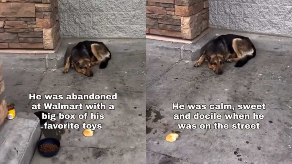 The video tells the story of a dog who was abandoned outside Walmart with his toys and stayed there for three days before animal control arrived. The video says that the German Shepherd was “calm, sweet and docile.”